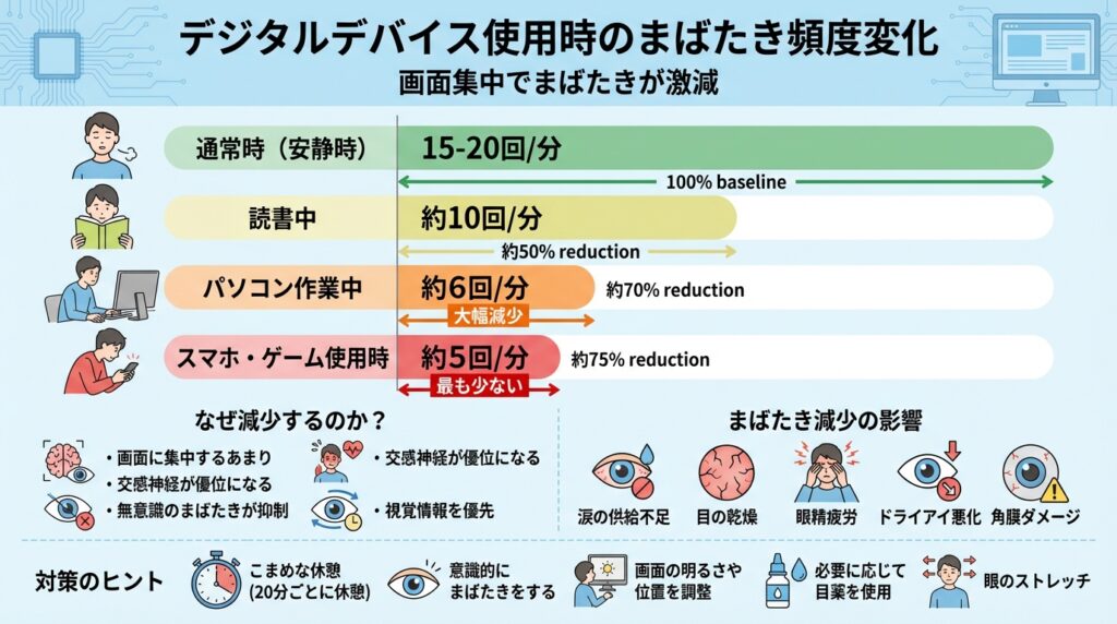 パソコン作業やスマートフォンの使用時には、集中によって自律神経が緊張状態(交感神経優位)になるため、無意識のまばたきが抑制されて瞬きの回数が大幅に減少します。