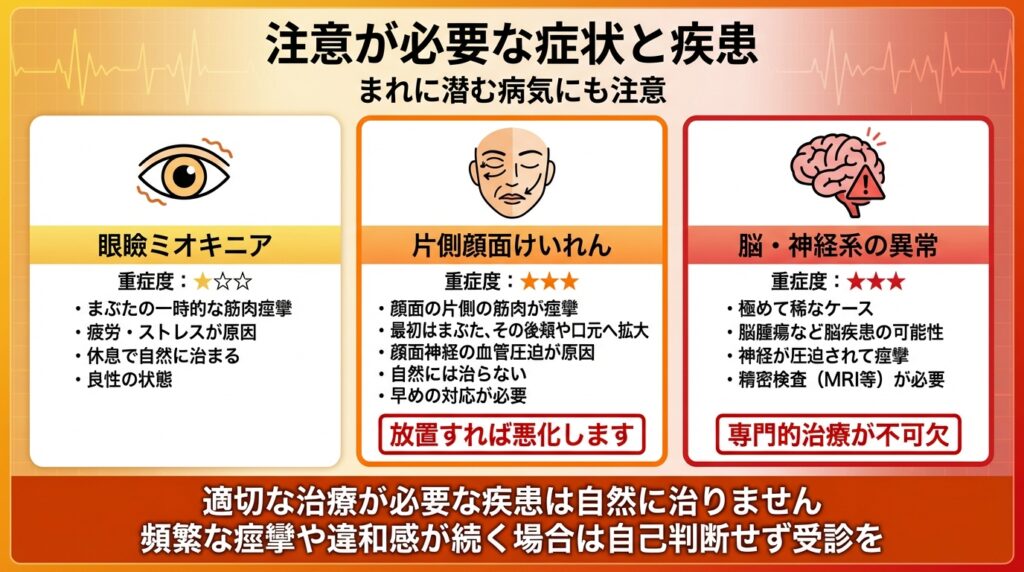 まぶたのピクピクは大半が一時的な生理現象ですが、ごくまれに何らかの病気が隠れている可能性もあります。特に「ピクピクが長引いて何日も治まらない」「頻繁に繰り返す」「ピクピクの範囲がまぶた以外にも広がってきた」などの場合は注意が必要です。