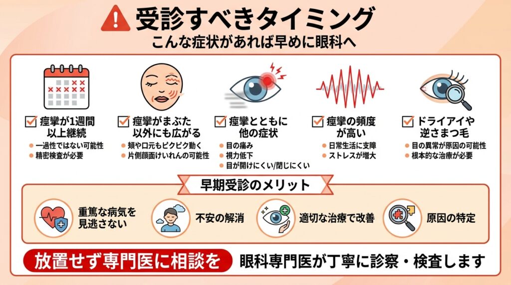痙攣の裏に隠れたドライアイや逆さまつ毛など目の異常が見つかれば、それに対する治療を行うことで根本的な改善が期待できます。何より「原因がはっきりしないままピクピクが続く」というストレスから解放されるという意味でも、専門医に相談するメリットは大きいと言えます。