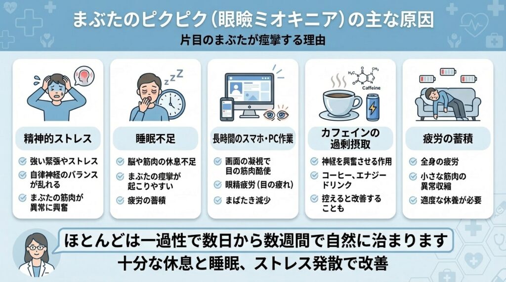 では、なぜまぶたの痙攣が起こるのでしょうか? 「まぶた ピクピク 原因」と検索する方も多いように、その原因は日常生活の中の身近な要因にあることがほとんどです。