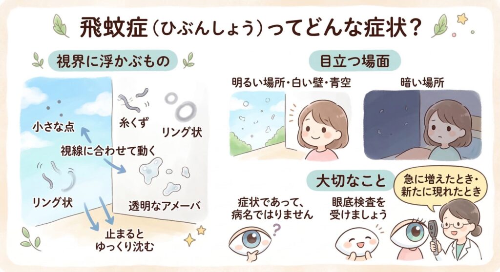 明るい場所や白い壁、青空を見たときに特に目立ちやすく、視線を動かすとふわふわと追いかけてきます。視線を止めるとゆっくりと沈んでいくのも特徴的です。暗い場所ではほとんど気にならず、明るい光のもとで目立ちます。