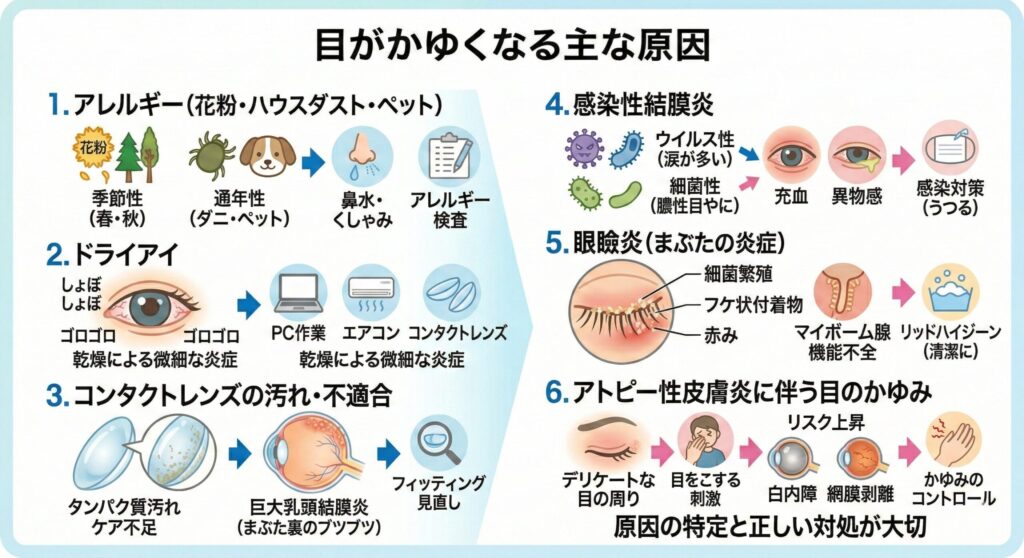 目のかゆみは日常で最もよくある目の症状のひとつです。多くはアレルギーが原因ですが、ドライアイや感染症、まぶたの炎症が隠れていることもあります。