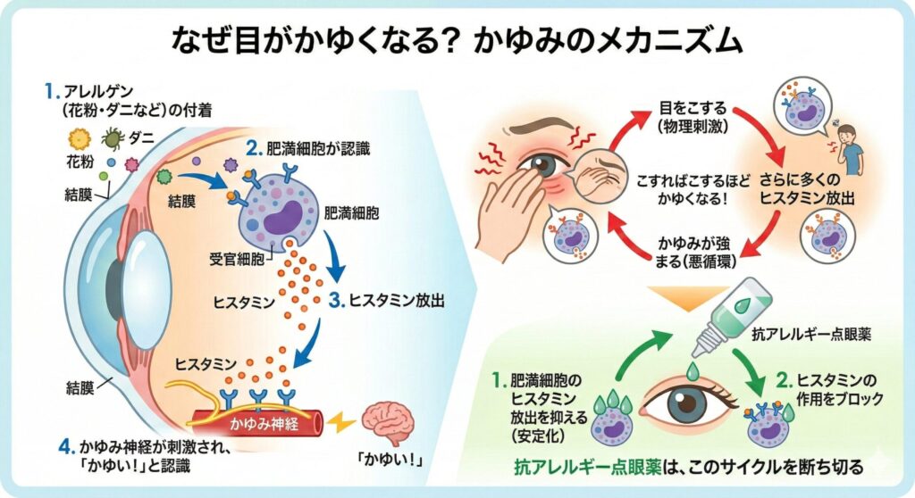 ここで目をこすると、こする物理的な刺激で肥満細胞からさらに多くのヒスタミンが放出され、かゆみが一層強まります。これが「こすればこするほどかゆくなる」悪循環の正体です。