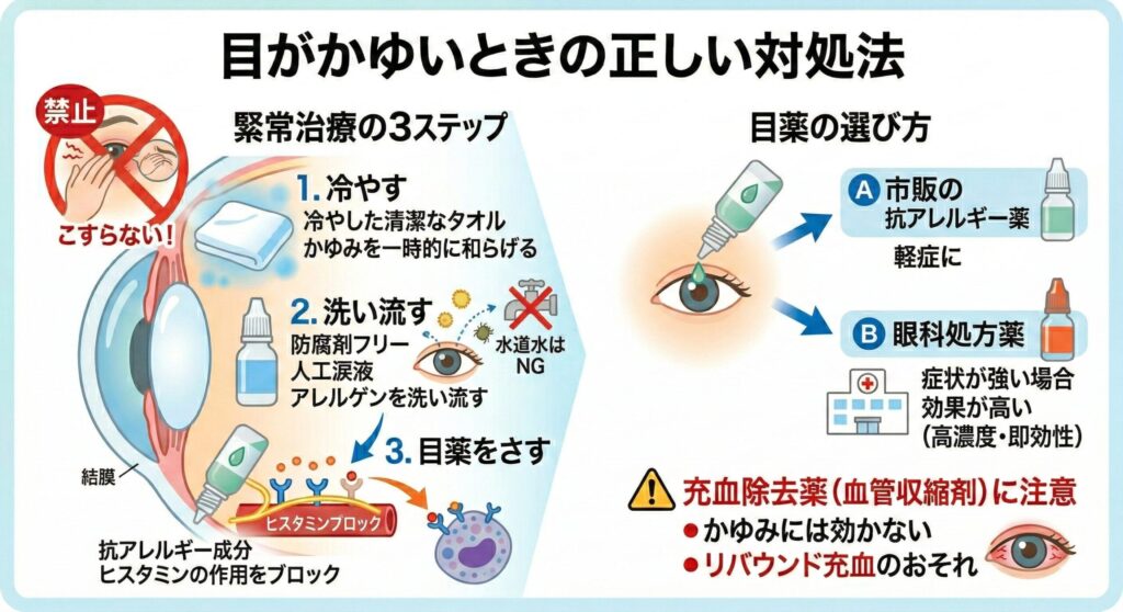注意していただきたいのが、市販の「充血除去目薬」(血管収縮剤入り)です。かゆみを抑える効果はなく、使用中止後にリバウンドで充血が悪化する原因になります。かゆみには抗アレルギー成分の目薬を選んでください。