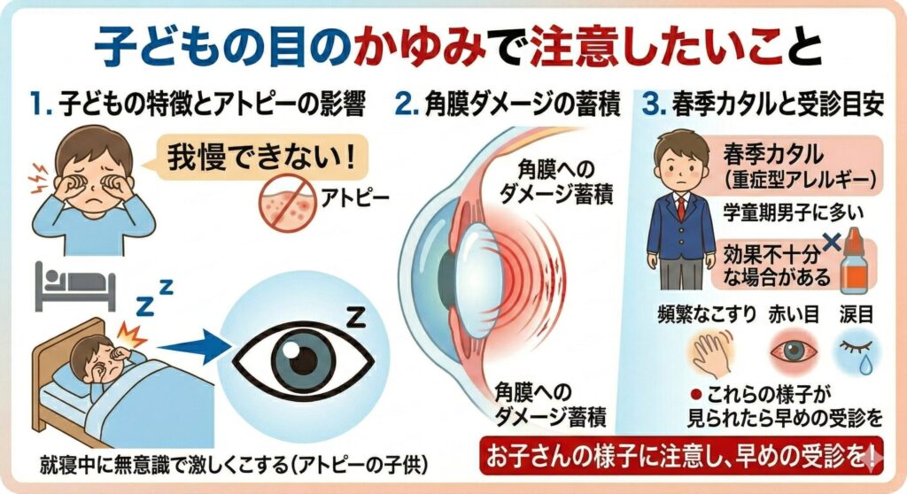 子どもは大人以上に目をこすりやすく、かゆみを我慢することが難しいため注意が必要です。特にアトピー性皮膚炎をお持ちのお子さんは、就寝中に無意識で激しく目をこすっていることがあり、角膜のダメージが蓄積しやすいです。