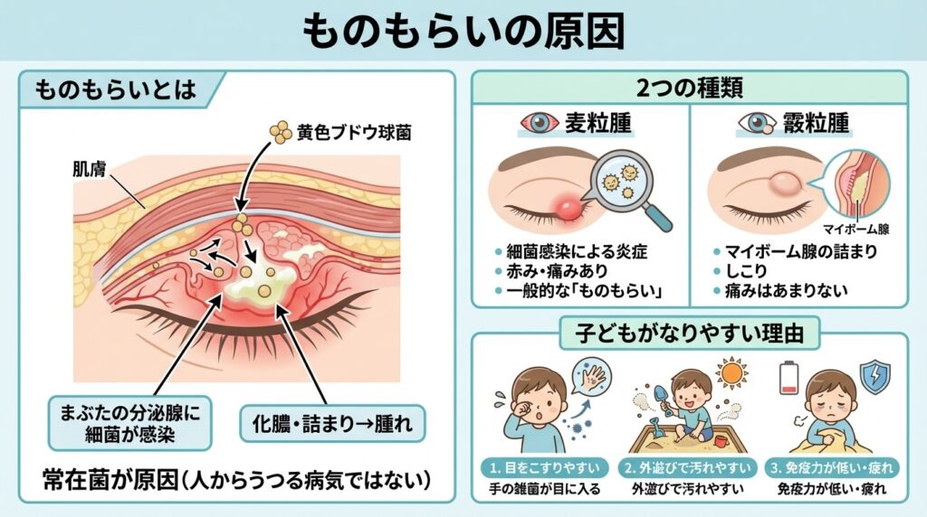 今回は、小学生のお子さんを持つ保護者の方向けに、ものもらい(麦粒腫・霰粒腫)の原因と症状、家庭でできるケア方法や眼科受診のタイミングについて、丁寧にご説明します。