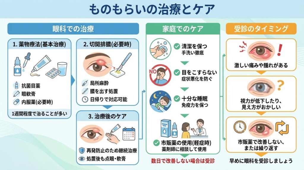 症状が軽い場合には、市販の抗菌目薬(第二類医薬品など)で様子を見る方法もあります。ドラッグストアには細菌の増殖を抑える抗菌成分や炎症を和らげる成分が入ったものもらい用目薬が市販されていますので、薬剤師さんに相談しながら使用するとよいでしょう。ただ、市販薬で治るケースもある一方で、完治までに時間がかかったり症状が悪化してしまう可能性も指摘されています。特にお子さんの場合、自己判断で長引かせるのは避けたいところです。数日試しても改善しない場合や腫れ・痛みが強い場合は、早めに眼科を受診して適切な治療を受けることをおすすめします。
