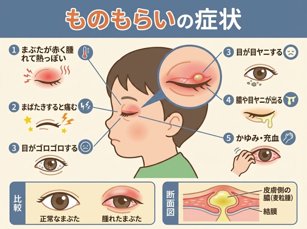 典型的なものもらいの症状は次のとおりです。